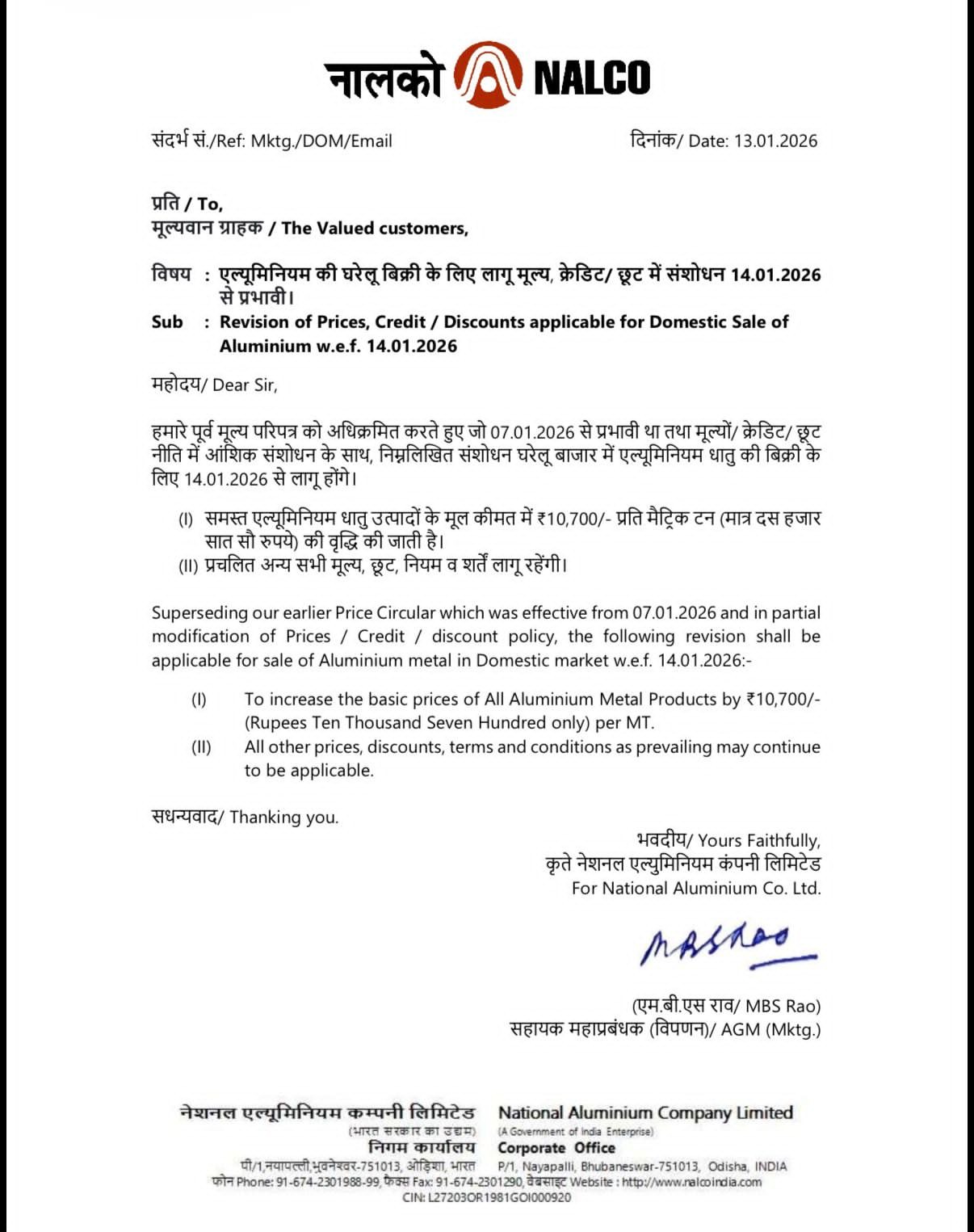 Revision of Prices, Credit / Discounts applicable for Domestic Sale of Aluminium w.e.f. 14.01.2026